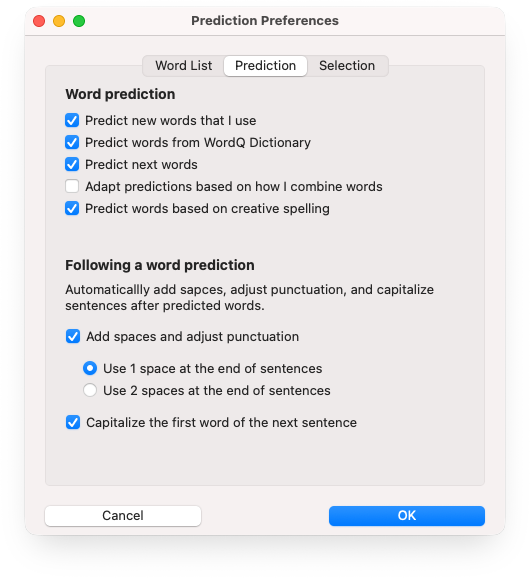 Add spaces and adjust punctuation. You can choose to let WordQ automatically add a space after you select a predicted word. When you type a punctuation mark, WordQ will remove this training space, place the punctuation and add any necessary spaces. (Default = ON)