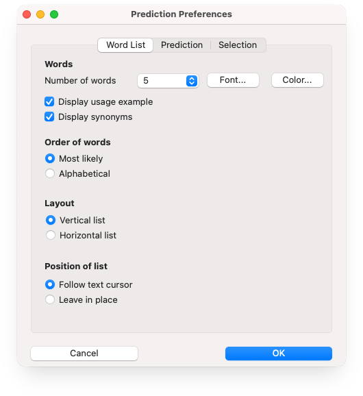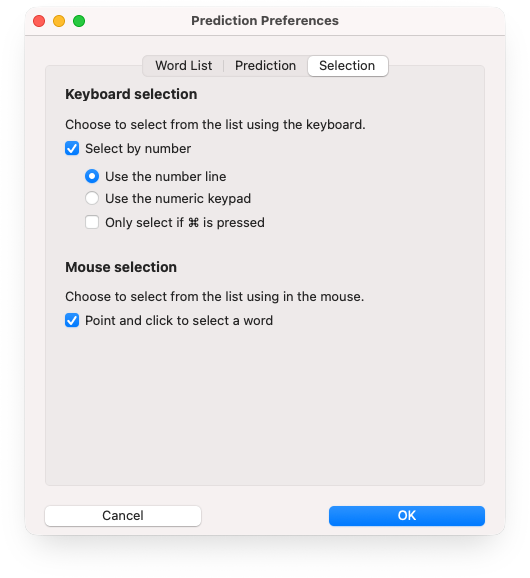 - Point and click to select a word enables selection of predicted words by a mouse/trackpad. (Default = ON)