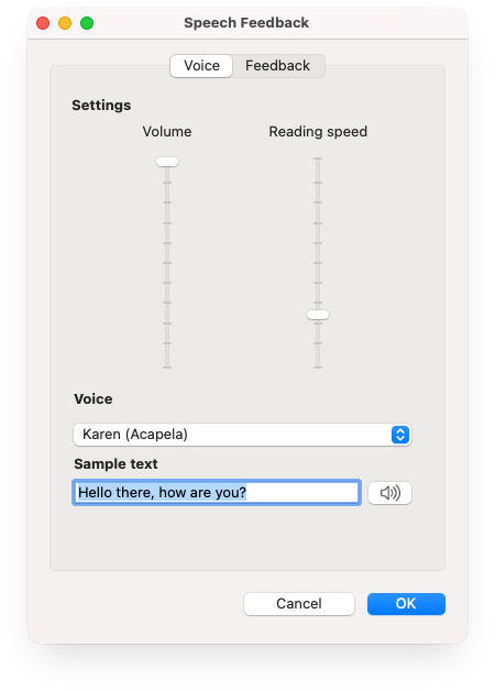 See Options>Speech Feedback for choosing the voice that you want. Voices that support word-by-word highlighting are indicated by *.